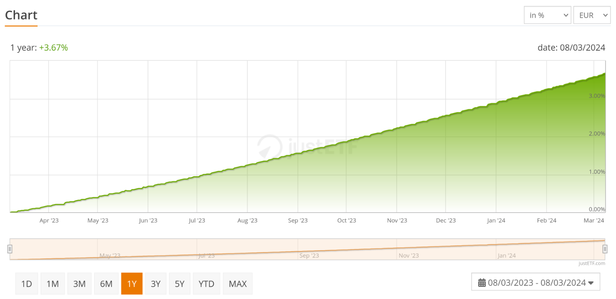 Sugli ETF monetari c’è poco da dire: il prezzo non è soggetto a fluttuazioni e questo risulta immediatamente visibile nel grafico dei rendimenti, anche a diverse cadenze temporali.