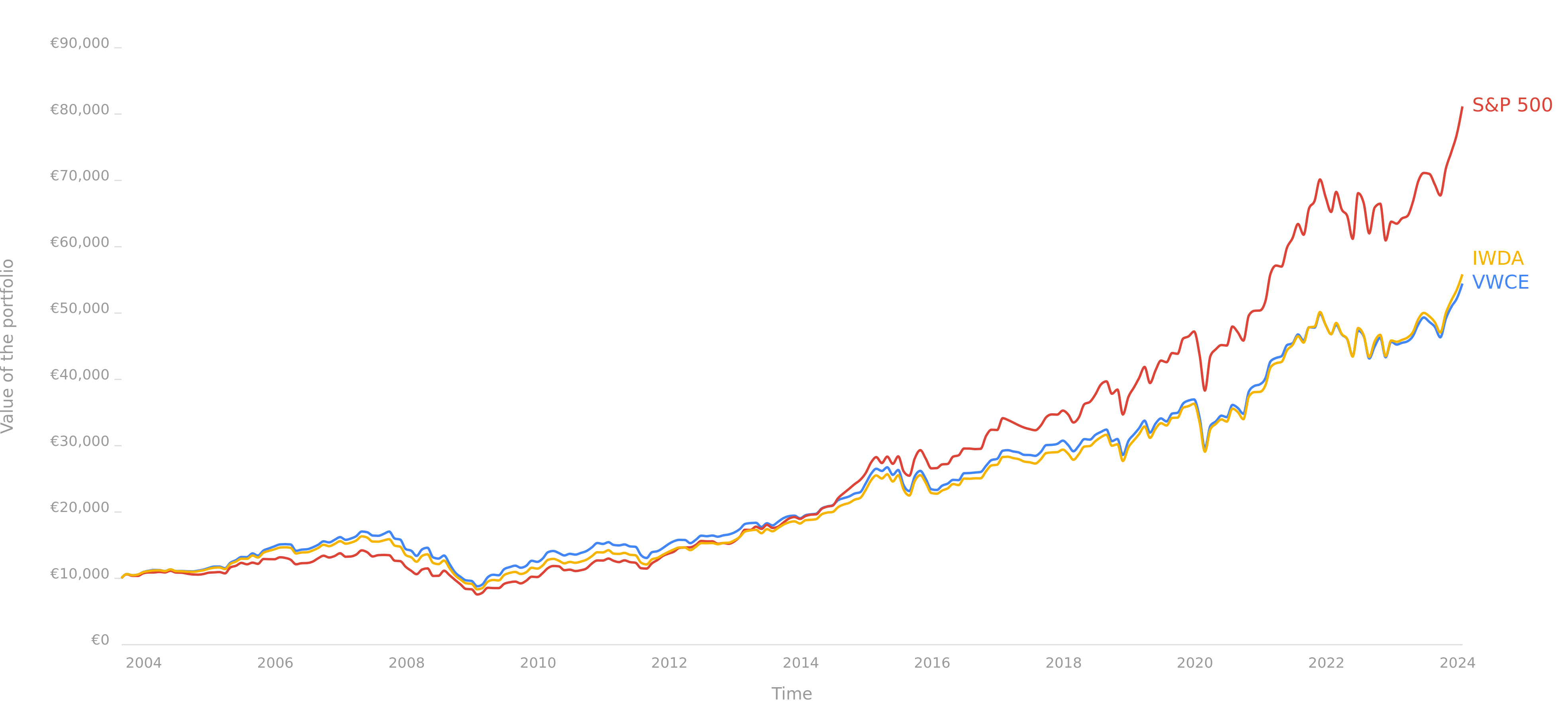 Rendimenti dal 2004 al 2024 di SP500, IWDA (Developed), VWCE (All-World)